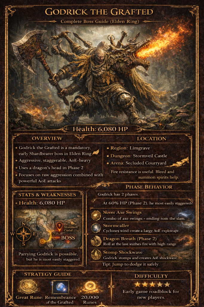 Godrick the Grafted is the first major Shardbearer boss in Elden Ring. He rules over Stormveil Castle and represents the first true skill wall after Margit.